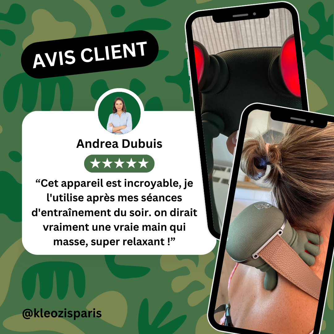 “Il soulage mes tensions cervicales en quelques minutes avec ses formes de mains et la fonction chauffante est un vrai plus.”! – ★★★★★